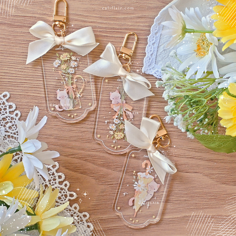 A cute daisy kitty acrylic charm you can purchase to hang off your bag!