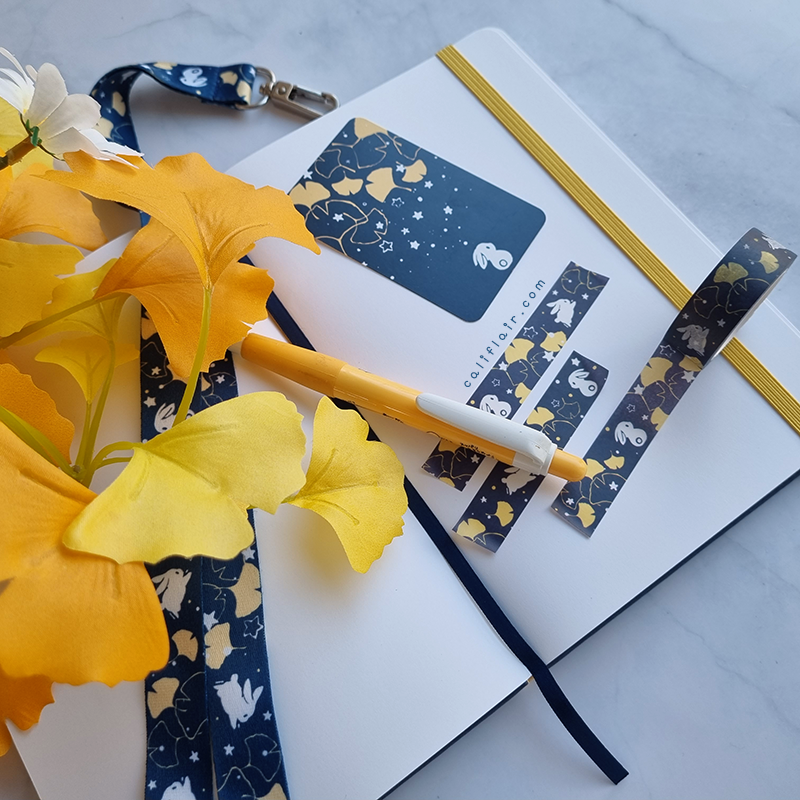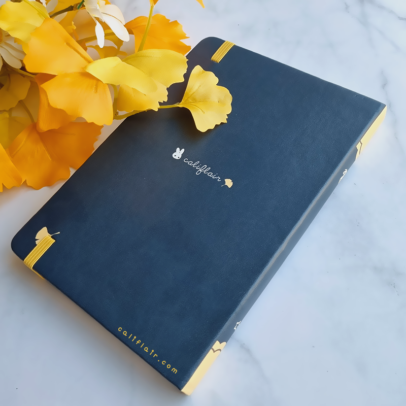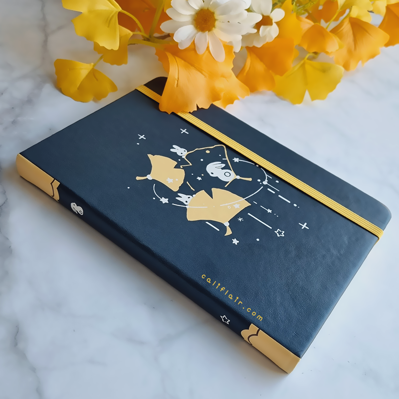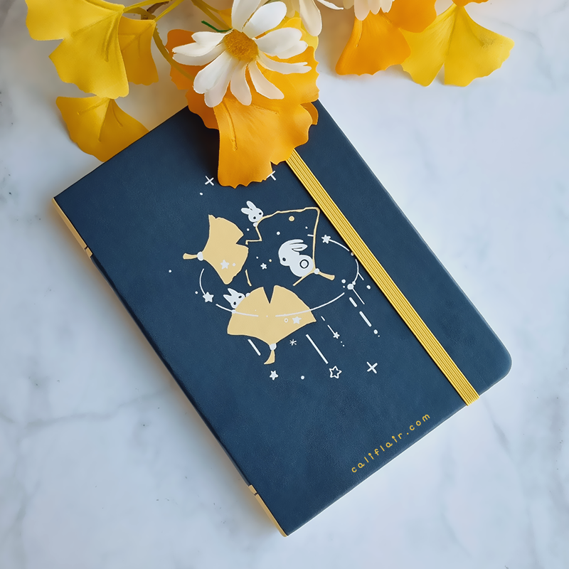 A sturdy, faux leather hard-cover notebook. Features chic solid navy color against cute ginkgo bunnies ♡ Log your sketches, writing ideas, self notes, and more!