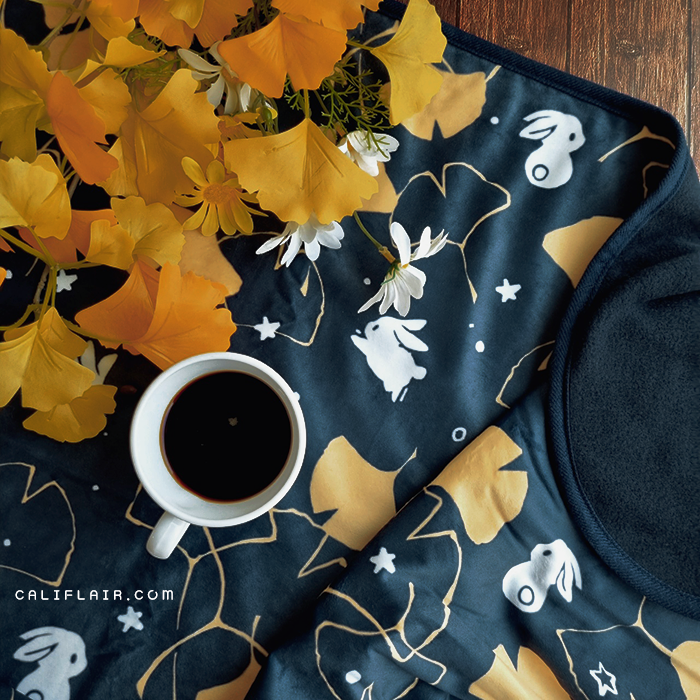 Lap blanket with the ginkgo bunny pattern for golden & navy autumn vibes ♡ Bring a classy, cute accent to your room with this soft ginkgo bunny blanket!