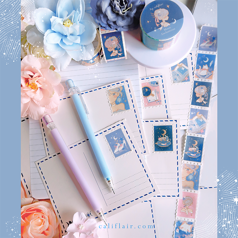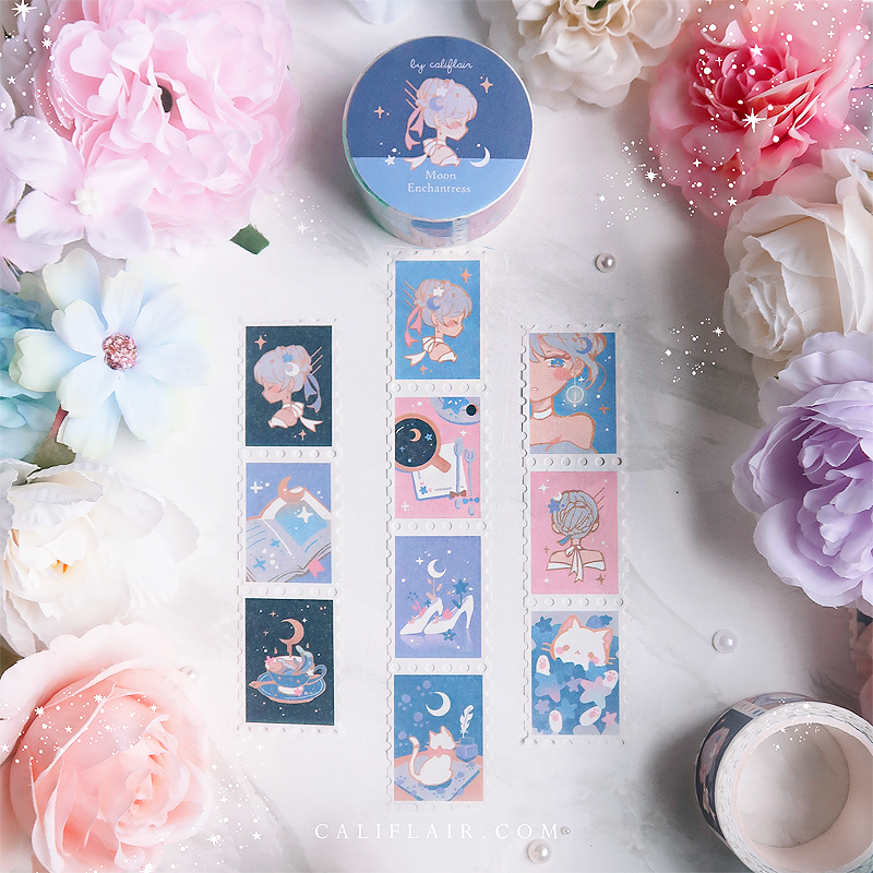 A roll of elegant the Moon Enchantress themed washi tape, featuring stamp-like shape. Bring a magical night flair to your journals and envelopes with this washi tape!