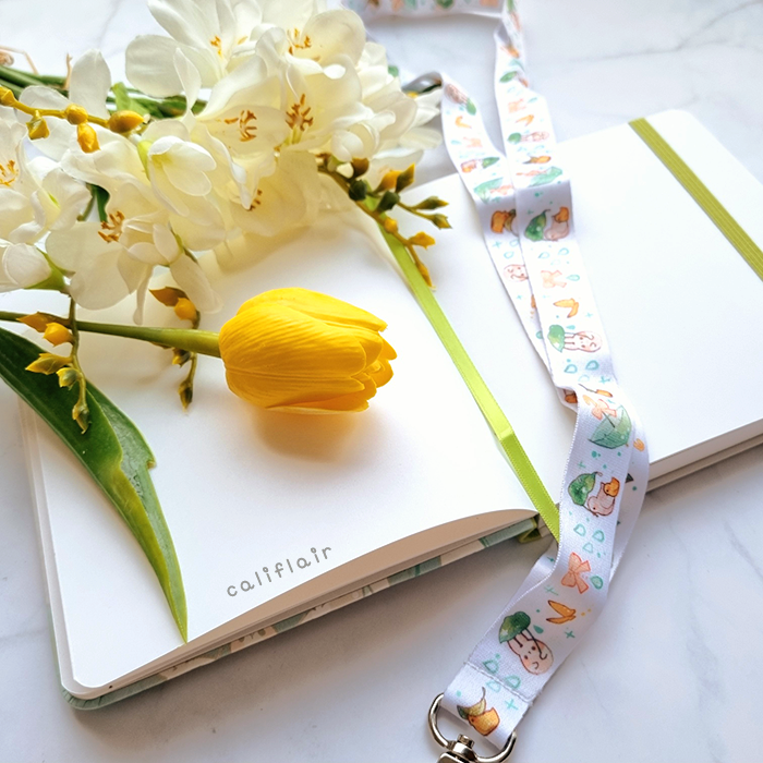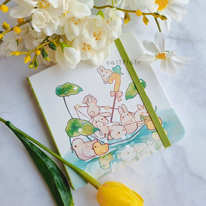 A sturdy, faux leather hard-cover notebook, in square dimension! Features warm yellow and green rainy vibes with cute bunnies and duckies ♡ Log your sketches, writing ideas, self notes, and more~